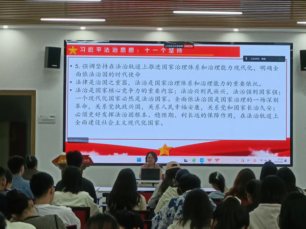 王晓燕以习近平法治思想体系化阐释为切入点,立足“十一个坚持”核心要义展开学理阐释,采用总分式架构逐层解构各“坚持”的理论终点和对于建设法治国家的现实意义,继而利用两个案例“说开去”解析刷单等违法行为的套路,从法理逻辑、社会危害、司法实践多维度解析新型违法样态,进一步强化青年学子法治思维与风险甄别能力。