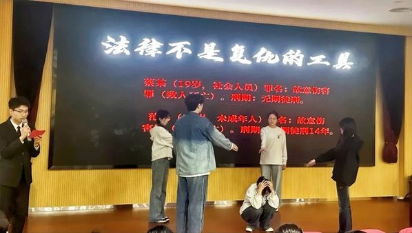 学院着力打造“党建+思政+法治”育人品牌项目,本次活动突出了“党员带团员、学长引学弟”传帮带的作用。党员与团员共同组建“法护青芽”实践团,在思政课堂上创新性打造法治情景剧场。通过同一案情的双轨演绎:当“失控线”中的蔡某某挥刀酿成三年铁窗悲剧,“理智线”里求助师长、依法维权的选择则铺展出向阳人生。双幕对照如重锤叩击心灵,让“一步错步步错”的警示超越法律条文,成为思政教育中“价值观抉择”的具象化呈现。