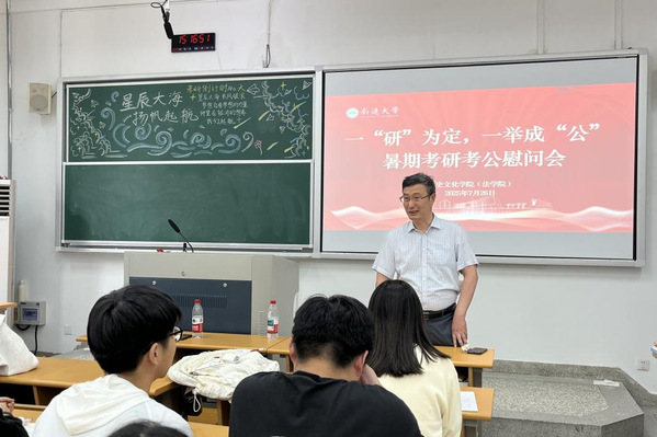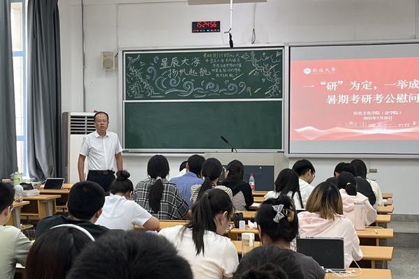 7月26日下午,365英国上市公司在线在3号楼103自习教室举办了“一‘研’为定 一举成‘公’”暑期考研考公慰问会暨留校学生安全教育活动。学院院长钱荣贵、党总支书记许慈晖、党总支副书记兼副院长袁小平、学工办主任陶慧来到教室,与留校备考学子亲切座谈,送上学院的深切关怀与殷切嘱托。